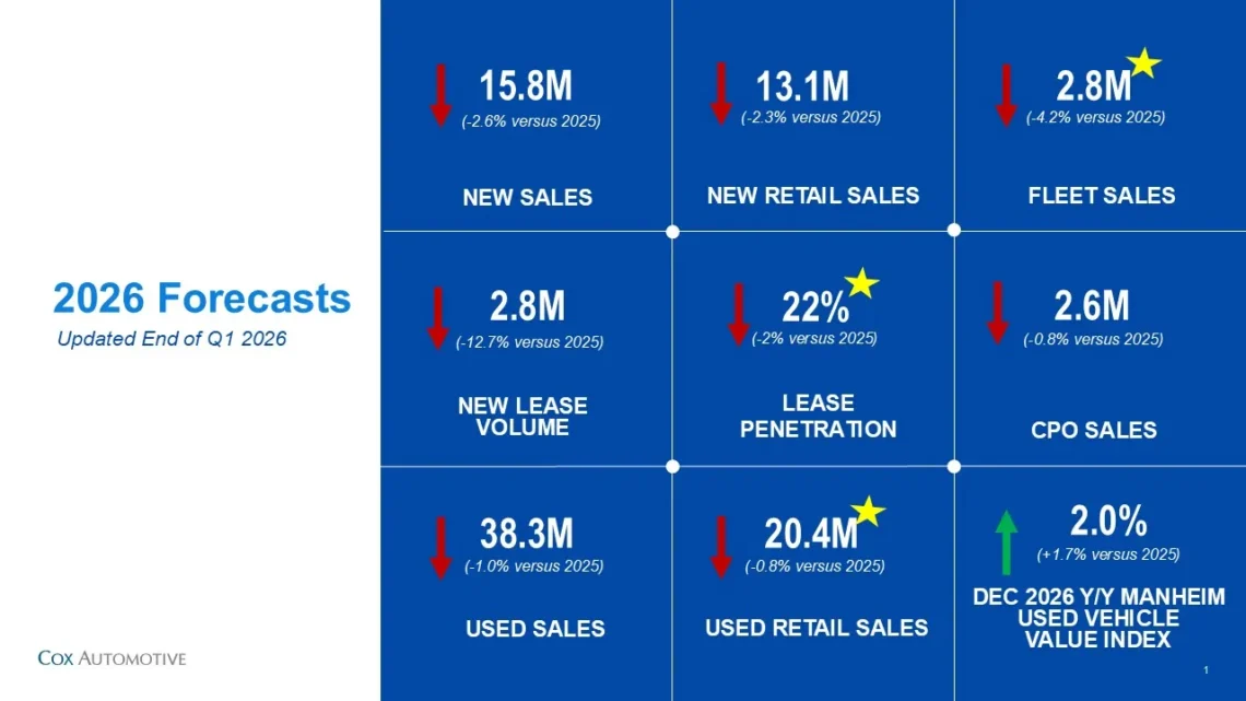 - New car sales: 15.8M (-2.6% vs. 2025)